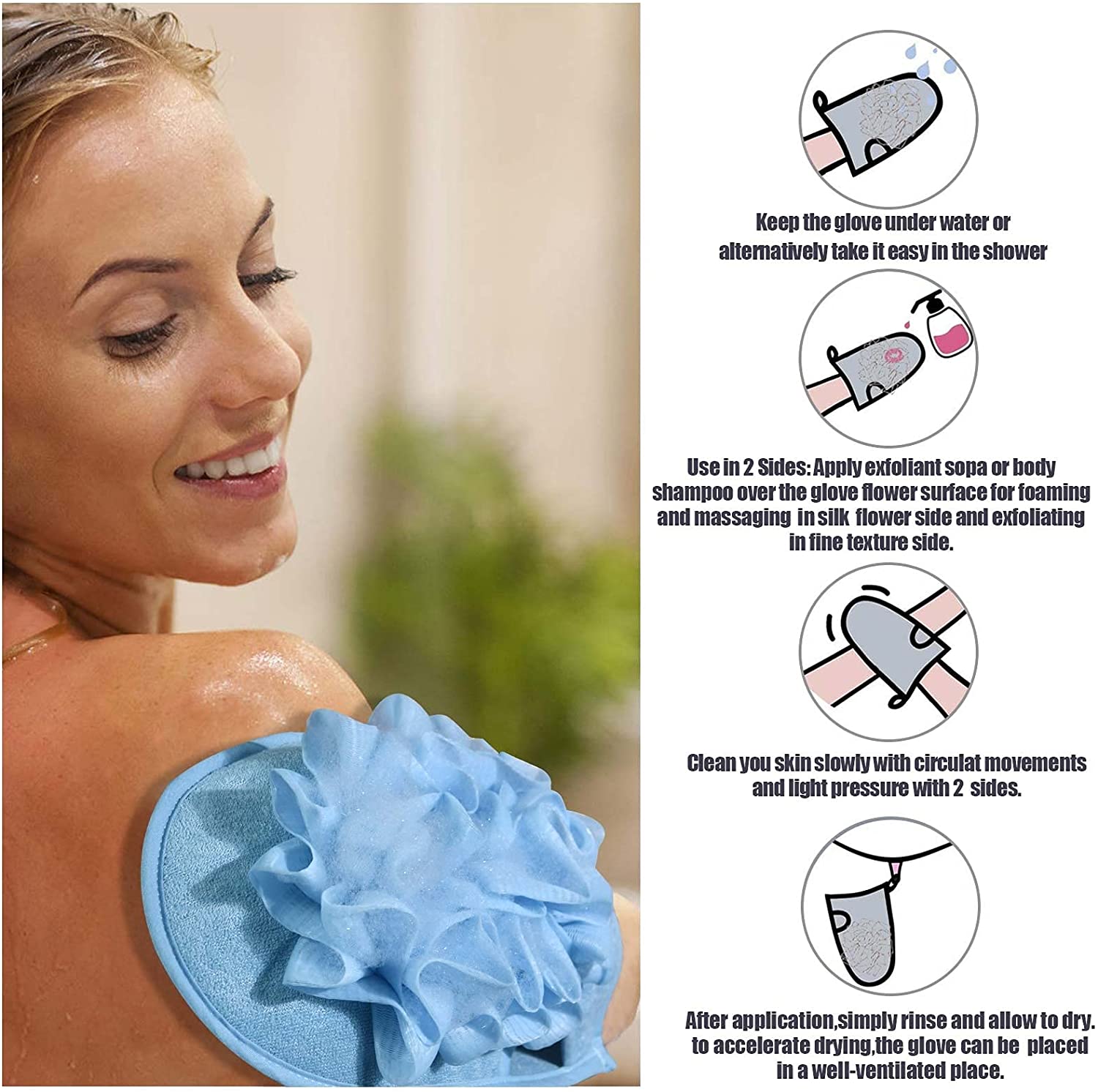 [ Multi-function Bath Sponge with Double Sides] The body brush is with double-sided design; one side with fine exfoliating texture for cleaning your body and removing dirt, while the other side with for massaging and deep exfoliation. This allows for a comfortable massage to promote blood circulation, relieve stress, deep clean stubborn keratin.