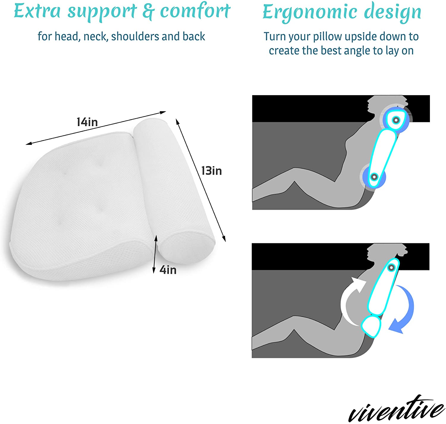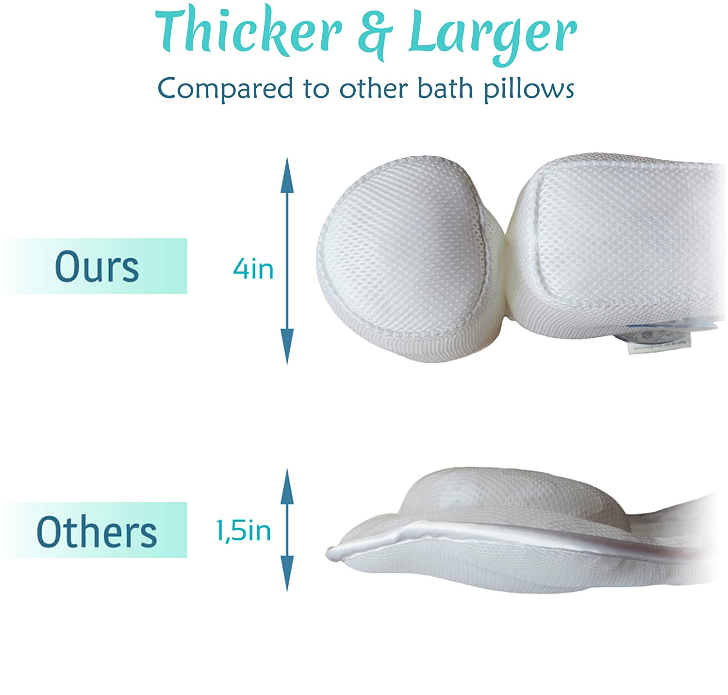 Comfort and Relaxation; Pamper yourself or your loved ones with a thick spa bath pillow; measuring 14 x 13 x 4 inches our luxury bathtub pillow is twice as thick and softer than most brands; unlike skimpier spa pillows, our premium orthopedic 2-panel cushion design contours and supports your head, neck, shoulders, and lower back for relaxing comfort