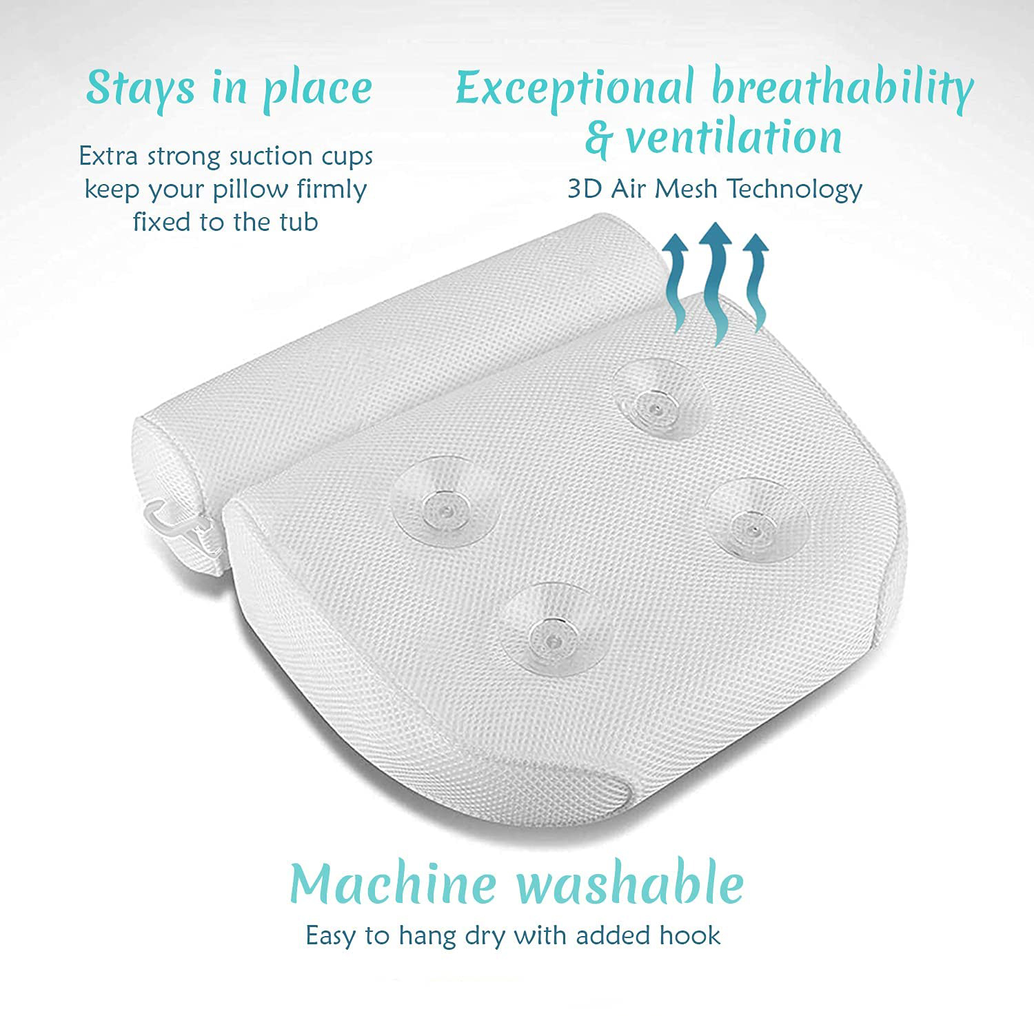 Easy Care and Durable; Our 3D air mesh technology material allows water and air to flow through the machine washable bathtub pillow; this bath neck pillow can be washed on cold water with a gentle detergent; never use bleach; the hot tub pillow comes with a hook hanger for easy hang-drying