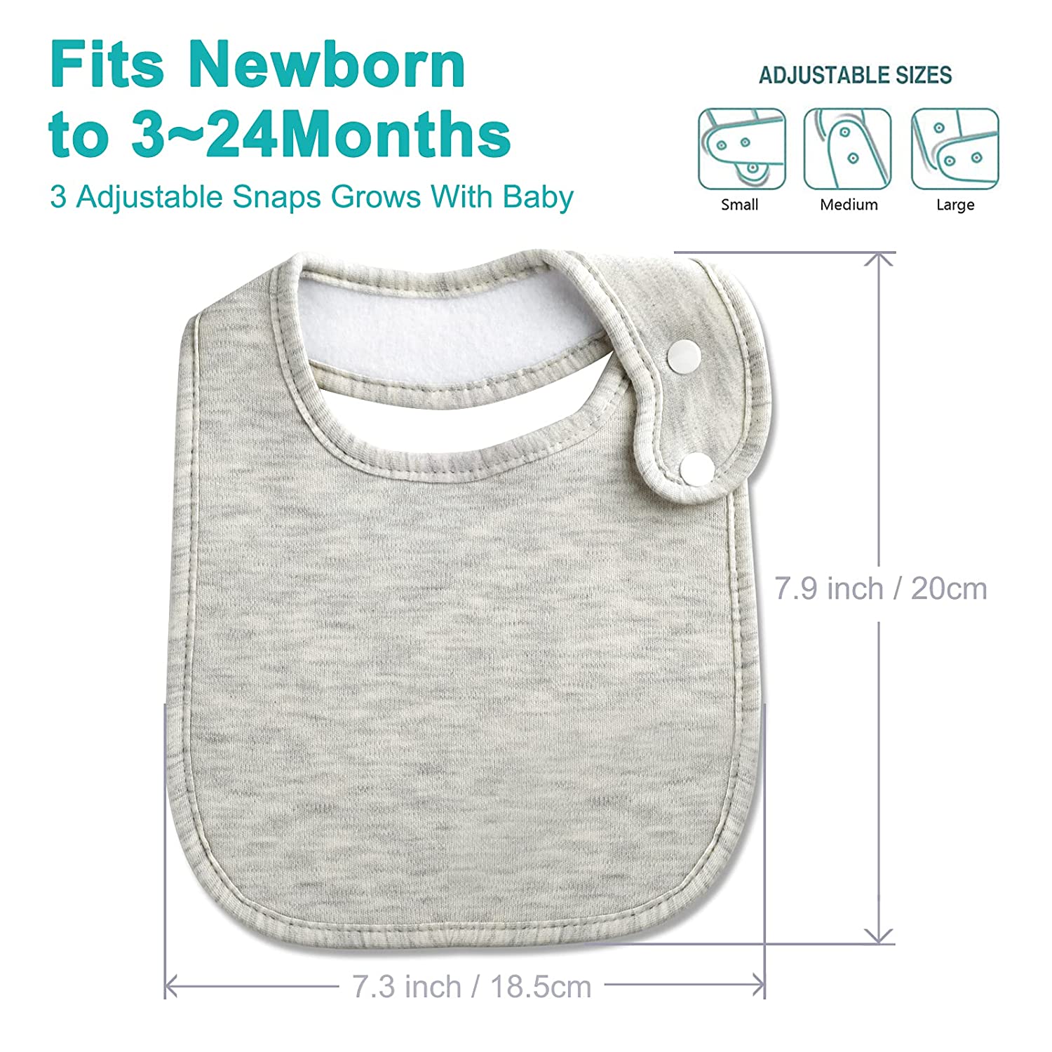 【3 SIZE ADJUSTABLE DROOL BIBS】Each baby bib has 2 sets of adjustable snaps to adjust the bib according to the size of the baby's neckline. Instead of Velcro, the baby bibs are fixed with snaps, so they are firm and not easy for babies to take off. The snaps are designed on the side of the bib instead of the back, making it easy to open and remove the bib from the side when the baby is asleep without waking the baby
