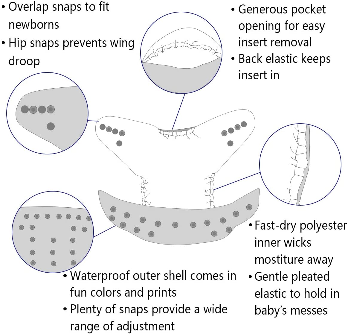 HAPPY BABY -Hip snaps and crossover snaps to prevent “wing droop”. Washable, waterproof and breathable.Comfortable elastic legging area to prevent leaking.