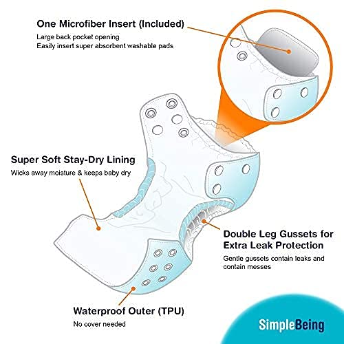 Simple Being Reusable Cloth Diapers, Double Gusset, One Size Adjustable, Washable Soft Absorbent, Waterproof Cover, Eco-Friendly Unisex Baby Girl Boy, 4-Layers Microfiber Inserts